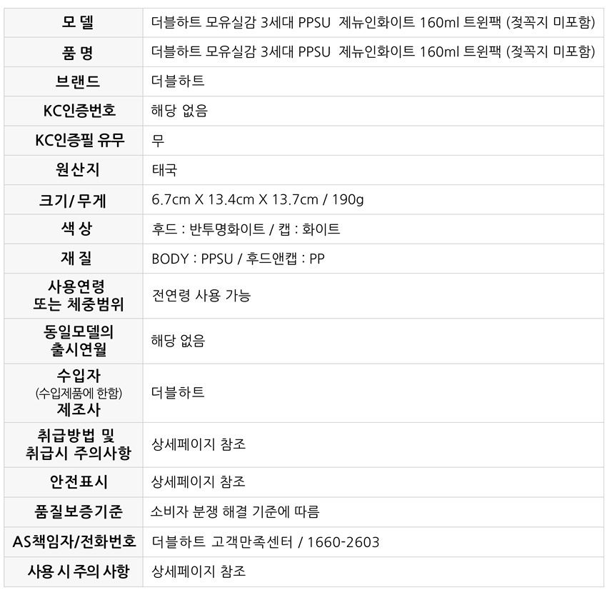 [더블하트] 모유실감 3세대 PPSU 트윈팩 160ml 노꼭지 (제뉴인화이트)